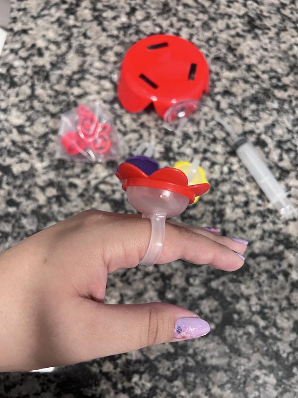 In all honesty I wasn’t sure about the Hummingbird Ring Feeder when I got. Never thought the birds would come that close. But setting on my back deck with my hand on the railing here they come. The love it. The small tip syringe makes it very easy to refill one the spot. When not wearing the rings I keep them on a jar on my deck so the hummingbirds will keep coming to them.