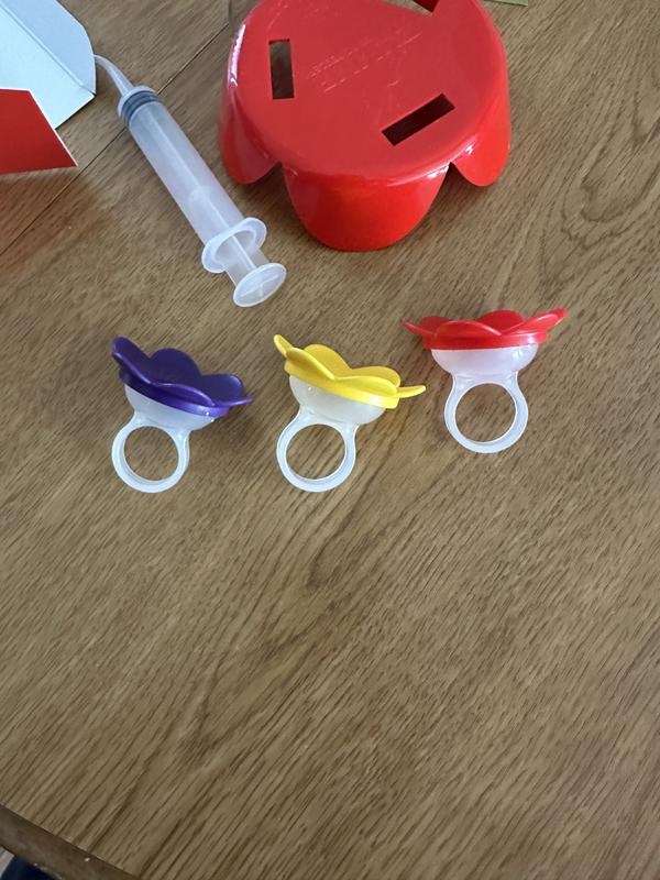 This product is very unique and is not something I would normally try out. The rings on the feeders are large enough to fit over my thumb, and even my husbands hands